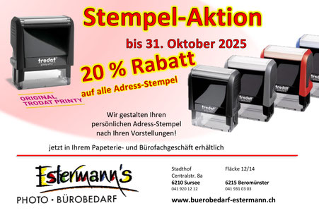 Papeterie · 25. August 2025 Adress-Stempel-Aktion Stempel-Aktion bis 31.10.2025 Profitieren Sie von unserer grossen Stempel-Aktion und bestellen Sie Ihren neuen Adress-Stempel. Sie profitieren von einem Vorzugsrabatt von 20 % bis 31.10.2025 tagPlaceholderTags: