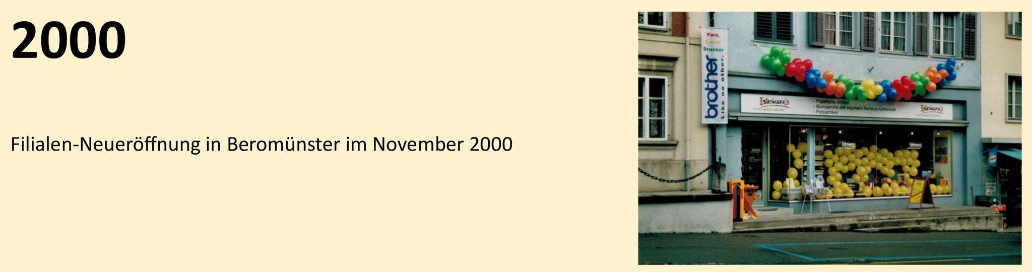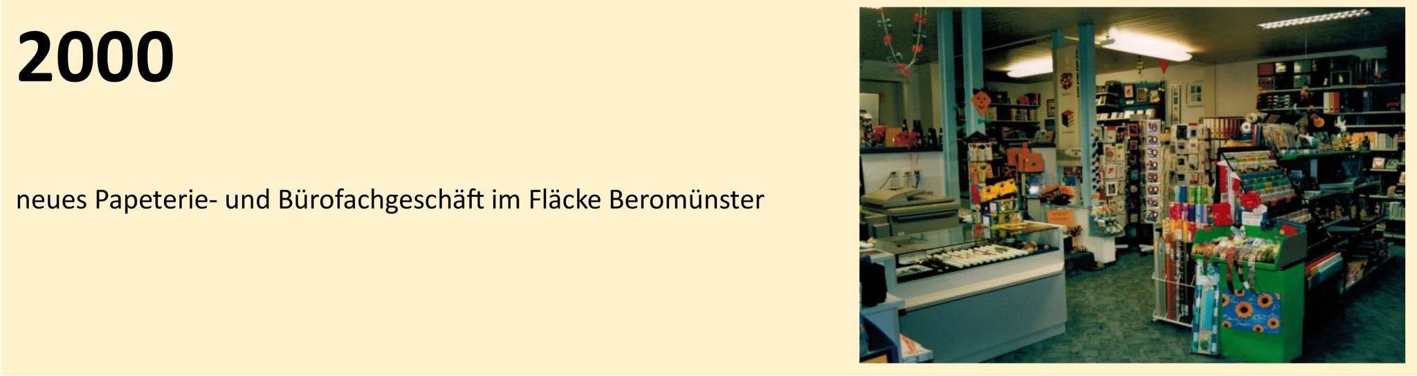 Im Jahr 2000 wurde mit der Eröffnung der ersten Filiale in Beromünster ein weiterer Grundstein gelegt und so konnte im Michelsamt die Kundennähe ausgebaut werden. Inzwischen ist der Personalbestand auf rund 10 Mitarbeiterinnen angewachsen und mit der Ausbildung von Lernenden im Detailhandel mit Fachrichtung Papeterie leisten wir auch einen guten Beitrag für den Erhalt unserer sehr interessanten und vielseitigen Branche. In der Zwischenzeit konnten mehr als 30 Lernende erfolgreich diesen schönen Beruf bei uns erlernen und abschliessen.