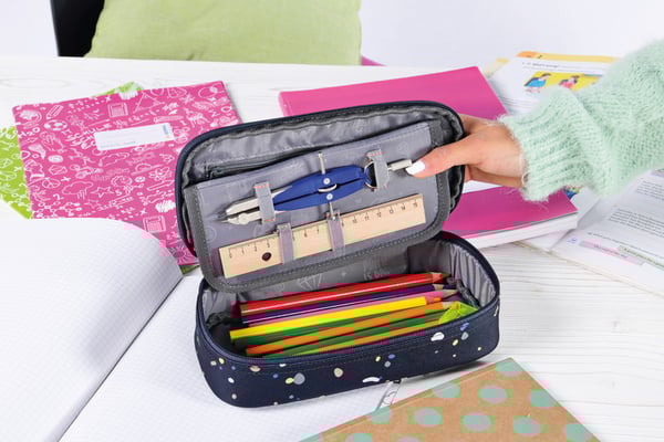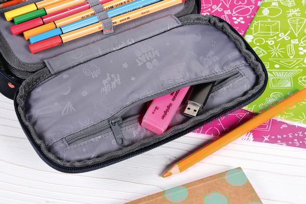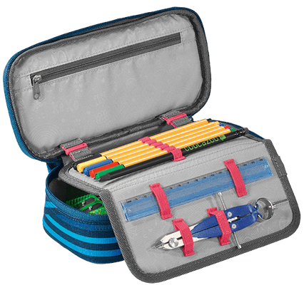 Schüttel-Etui mit Reissverschluss, Innenklappe für wichtige Schreib-Utensilien und Lineal, viel Platz für alles, was es in der Schule braucht.